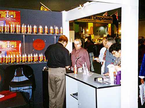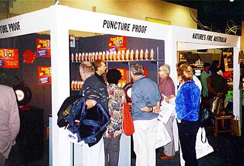 Our Australian Private labeler for Puncture Proof, Ming, at a show in Australia (1-3, 5). Display outside